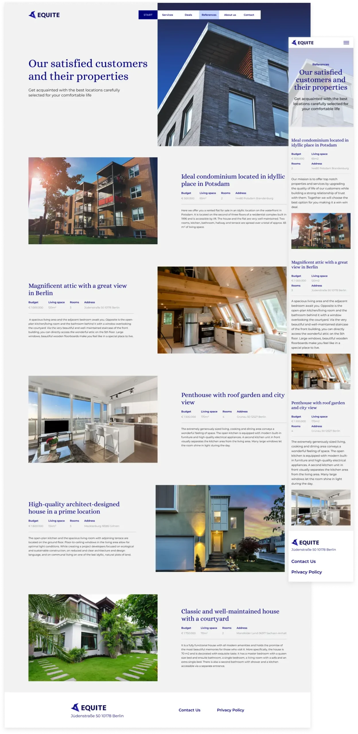 One of our key tasks was to showcase the past success of Equite. Customers can see a selection of properties that were acquired with the help of Equite as dream houses for their customers and see the key parameters of each property, noting that some properties were acquired substantially below market price.