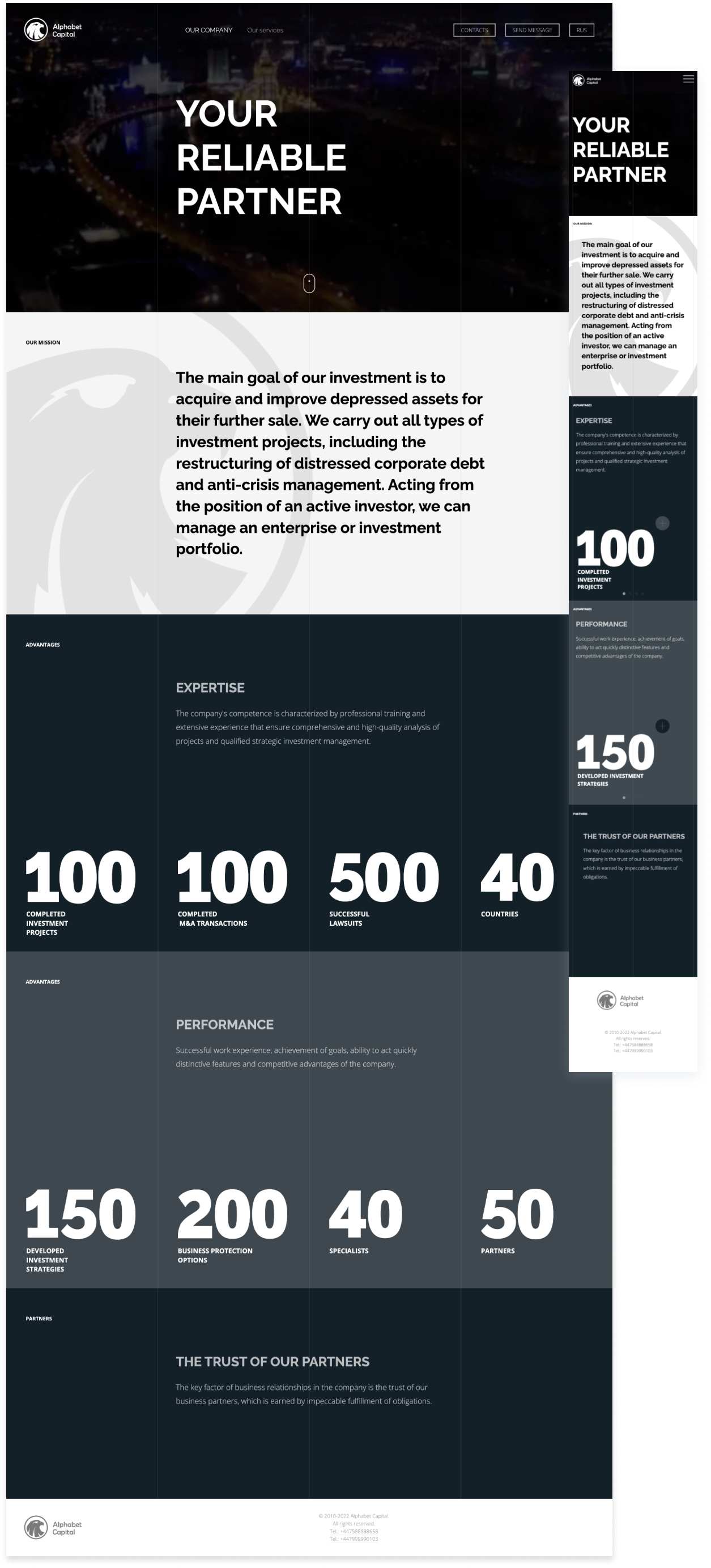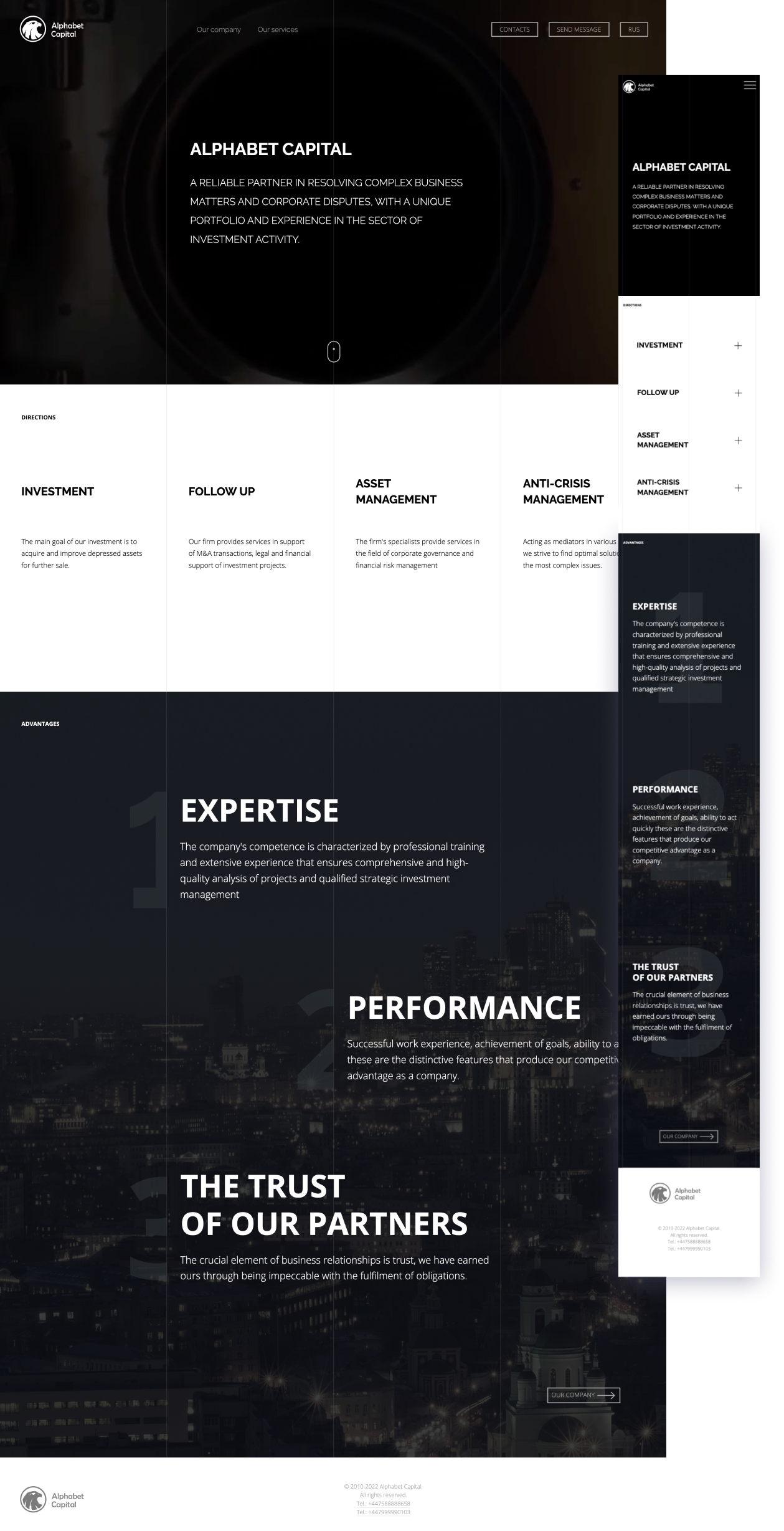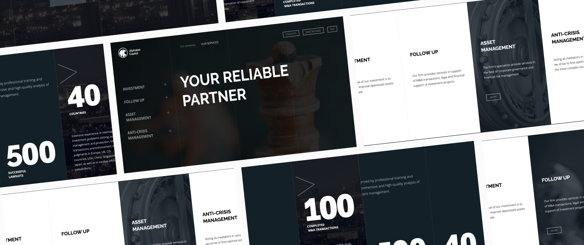 RevenueRush design experts were tasked with putting maximum emphasis on the thought-out copy of Alphabet Capital and managed it with a combination of on-hover animations and background movement, which bring life even to such a strict palette.