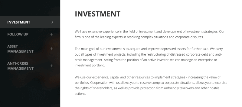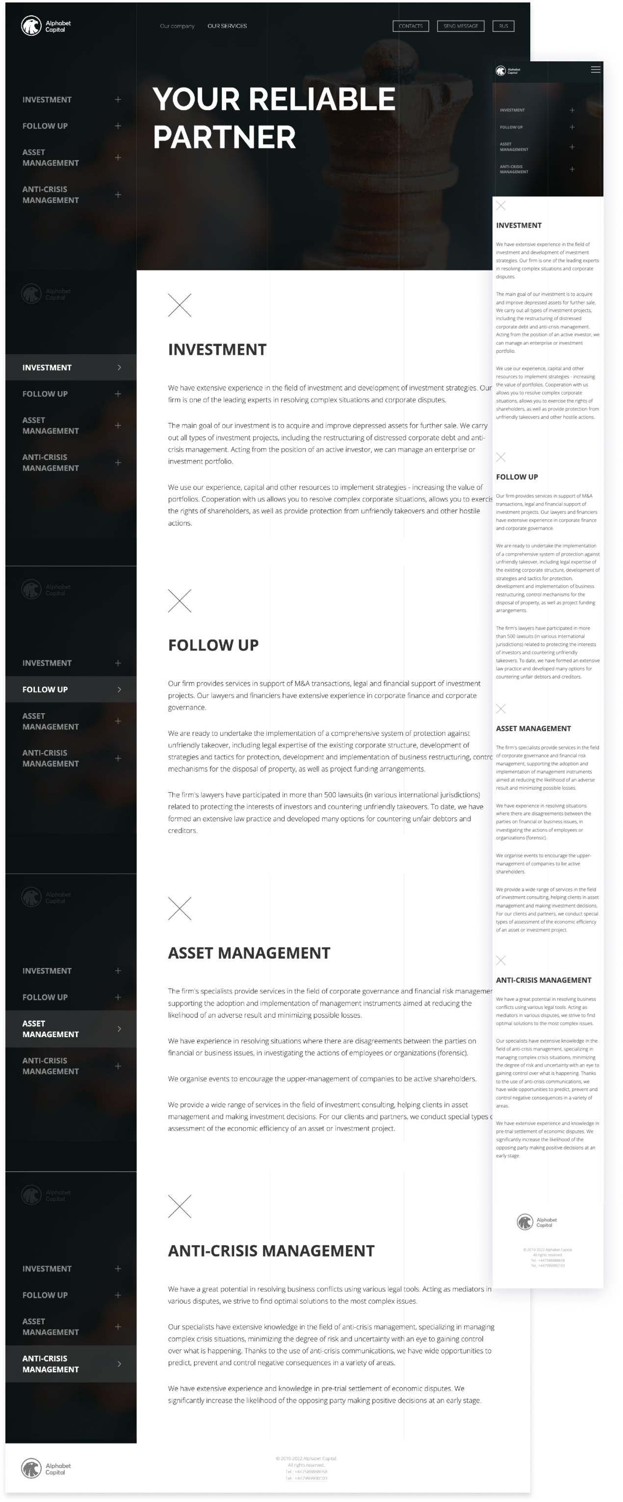 This page provides a simple overview of a1.fund solutions. Visitors see only the information pertaining to the service they are interested in, so the page doesn’t seem overbearing from the get-go, even though it contains a large volume of text.