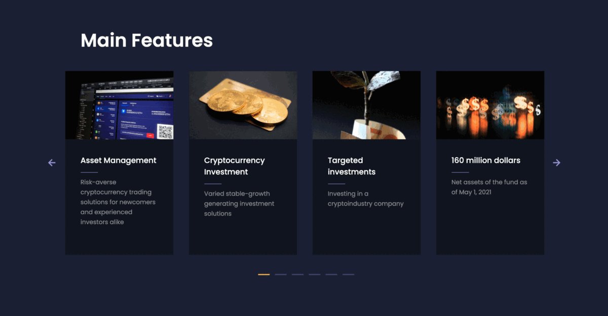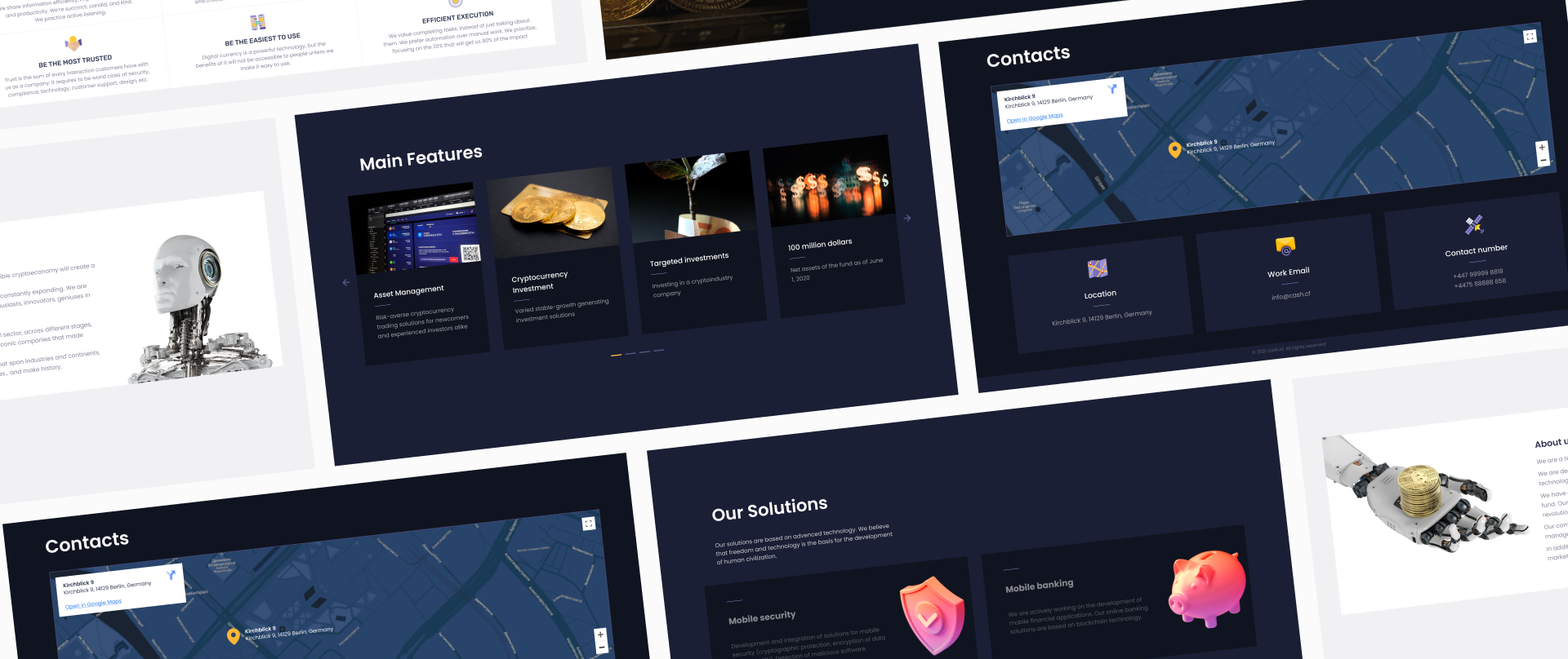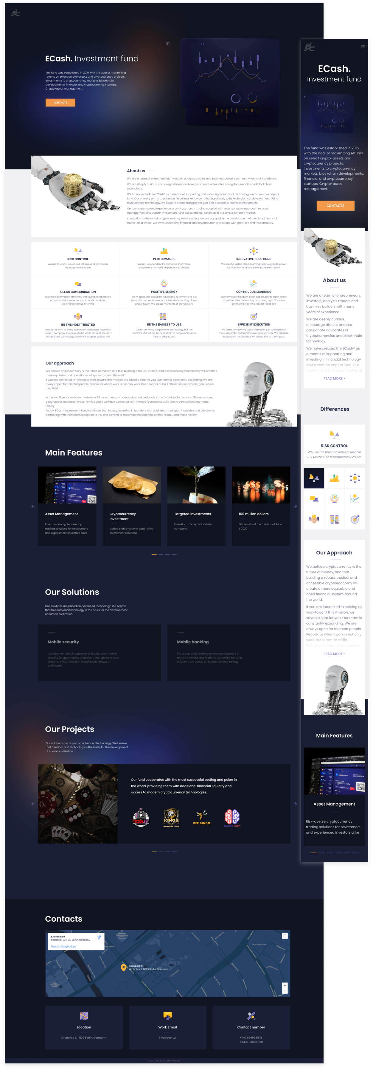 The home page’s goal is to make users familiar with Ecash investment fund and projects it invests in. We’ve helped cash.cf achieve this goal with a combination of small instances of subtle animation and motion layered into the design throughout the website and thoughtful copy that indicates their business goals, approaches, and advantages to potential partners and investors. Home page ends with a screen containing office location and contact info, and can also be accessed via a “contacts” CTA at the very top of the page.
