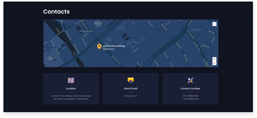 We’ve integrated Google maps into the website design to help add a human touch and put emphasis on the location of cash.cf business office. Together with simple info cards, this makes for a very straightforward contacts screen that establishes trust.