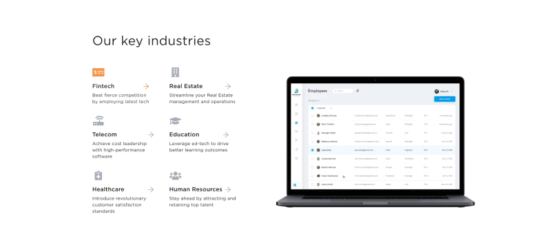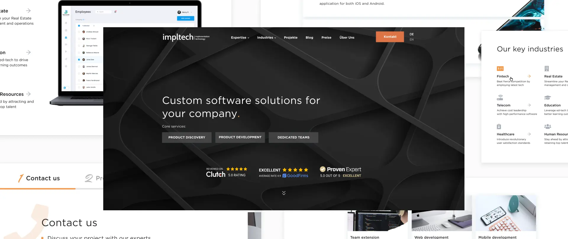 It’s always better to show instead of tell. Impltech key industries selector build visual associations, showcasing the notable projects impltech has done for each of their core industries. On hover over, a mockup for the respective industry is displayed. Users can also click on the industry they are interested in and end up on a dedicated page that goes over the solutions impltech provides for it.