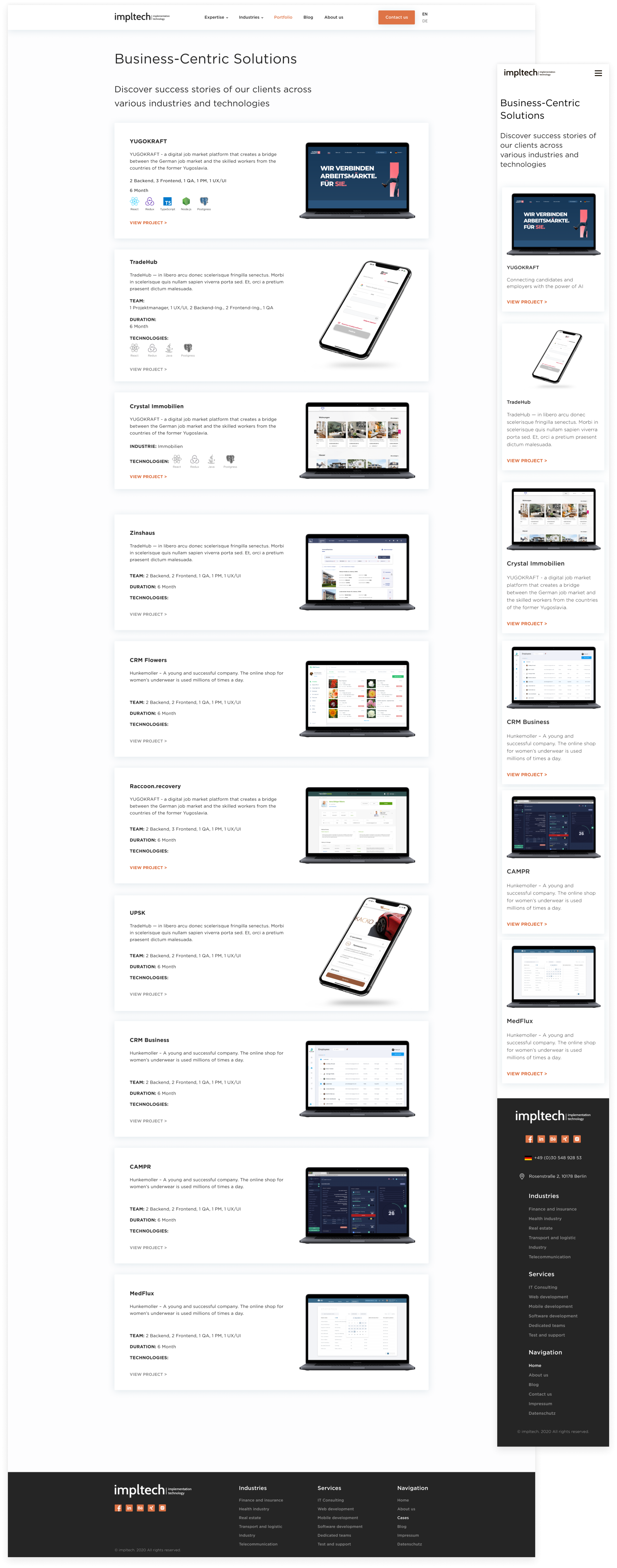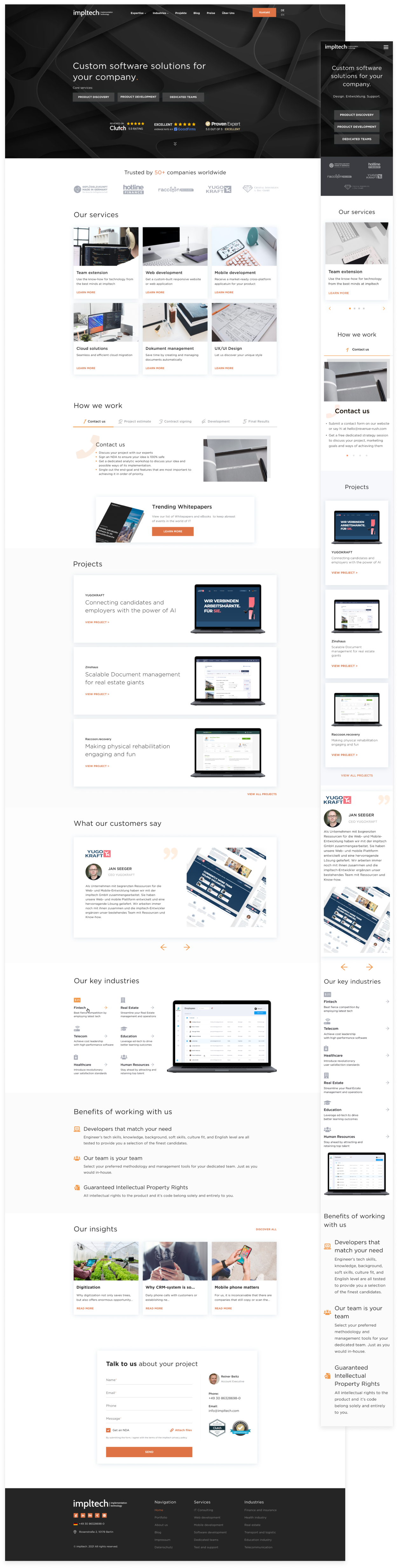 For impltech homepage, we opted for a high-level overview of their company, without going into too many details in any particular area. The page details impltech services, project approach, industries they work with, success stories of their clients, and impltech industry insights, positioning the brand as a reputable provider with deep technical expertise and complex projects under the belt.