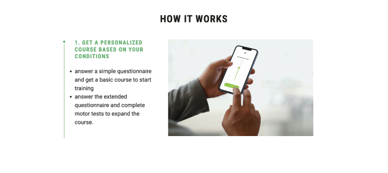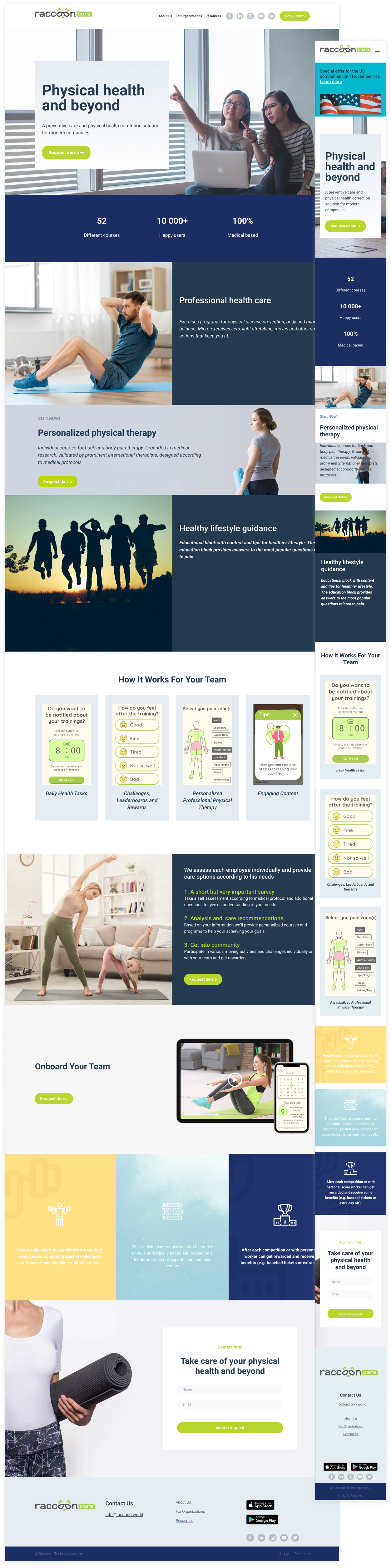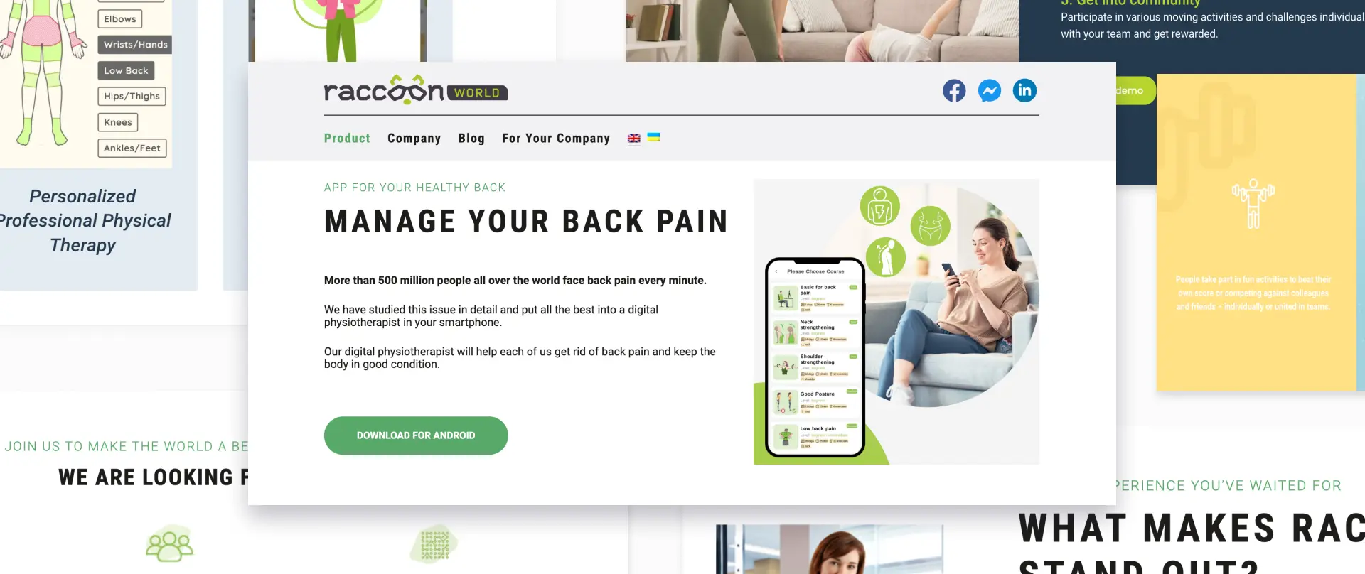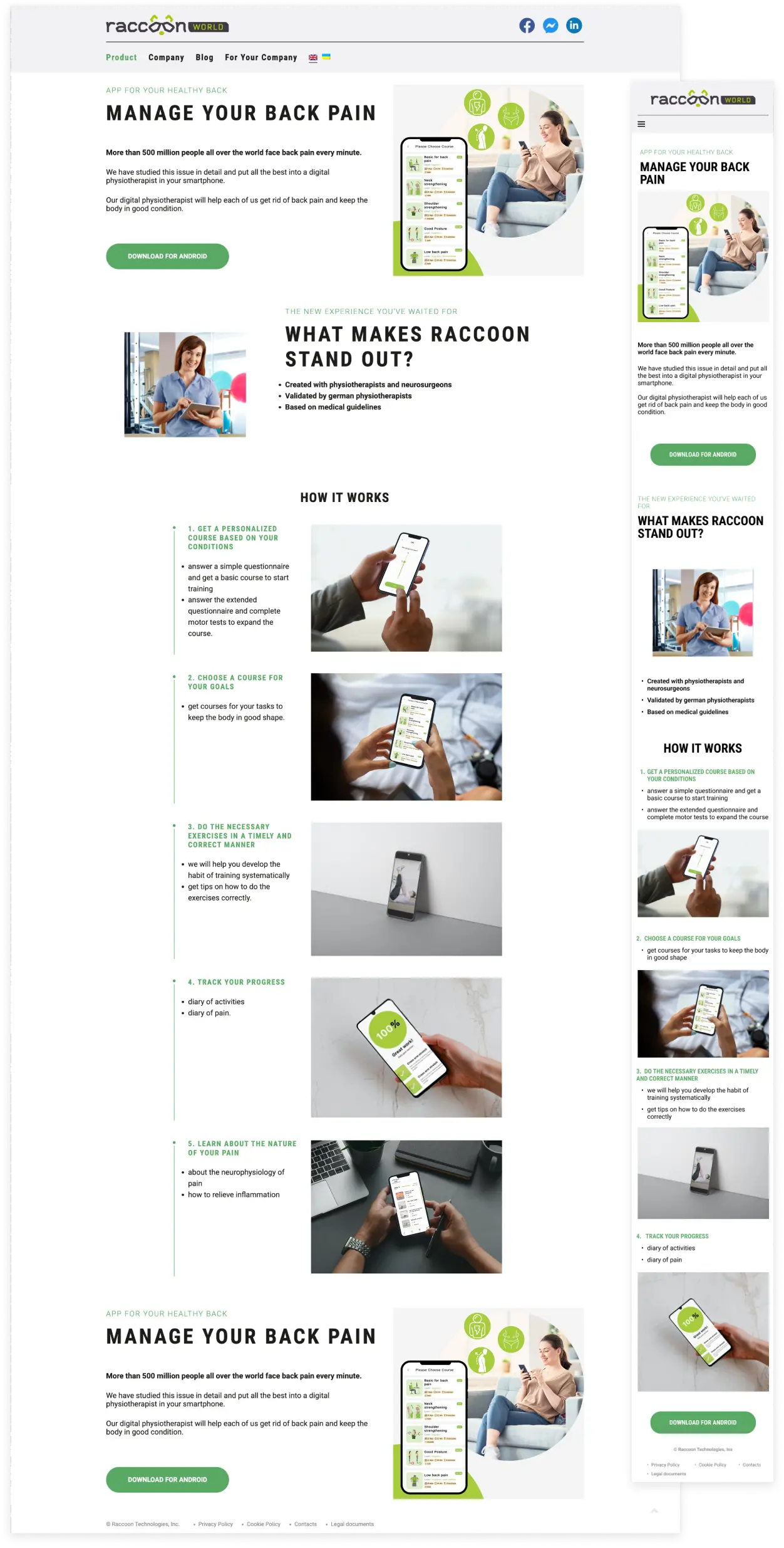 The main page of Raccoon World focuses on their mobile application and the benefits it can bring to users. Visitors are met with the promise of reduced back pain and then shown step by step how the application would help them manage their pain.