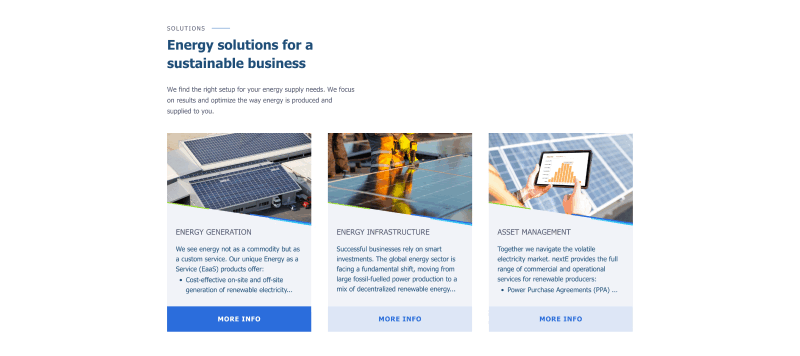 Nexte’s business is growing at a rapid pace. Investments in the renewable energy industry are expected to rise in the coming years, so, to make their business more scalable and pave the way for growth, Nexte turned to ColorCreative. They tasked us with the development of a professional corporate website that would provide detailed information on Nexte manufacturing business and their services.